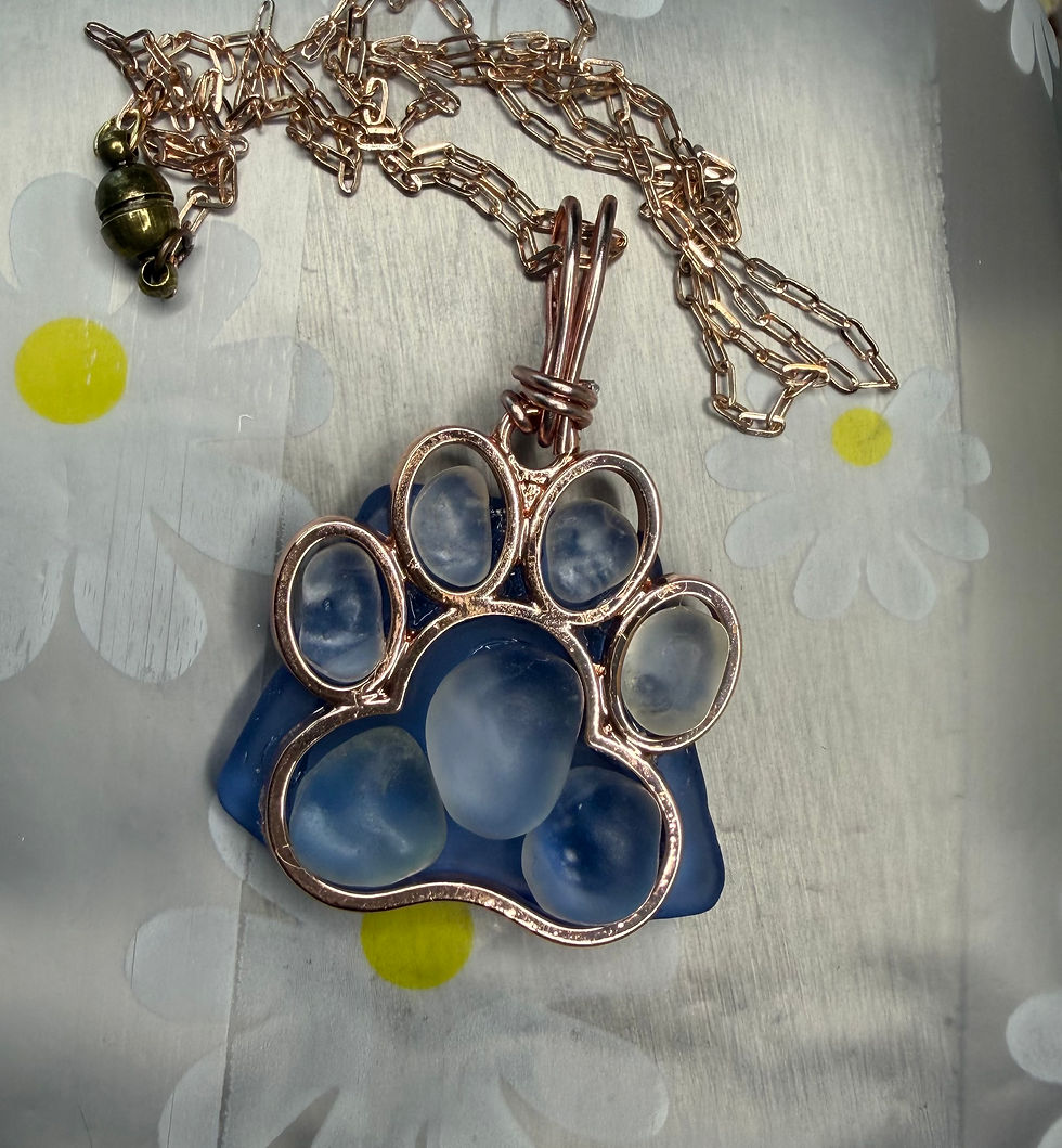 Blue & White Sea Glass Paw Print Necklace – Rose Gold Pet Jewelry